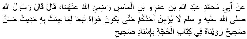 “None of you will believe until his desires follow in accordance with what I have come with.” (I have only translated the relevant portion of the Arabic text pictured.)